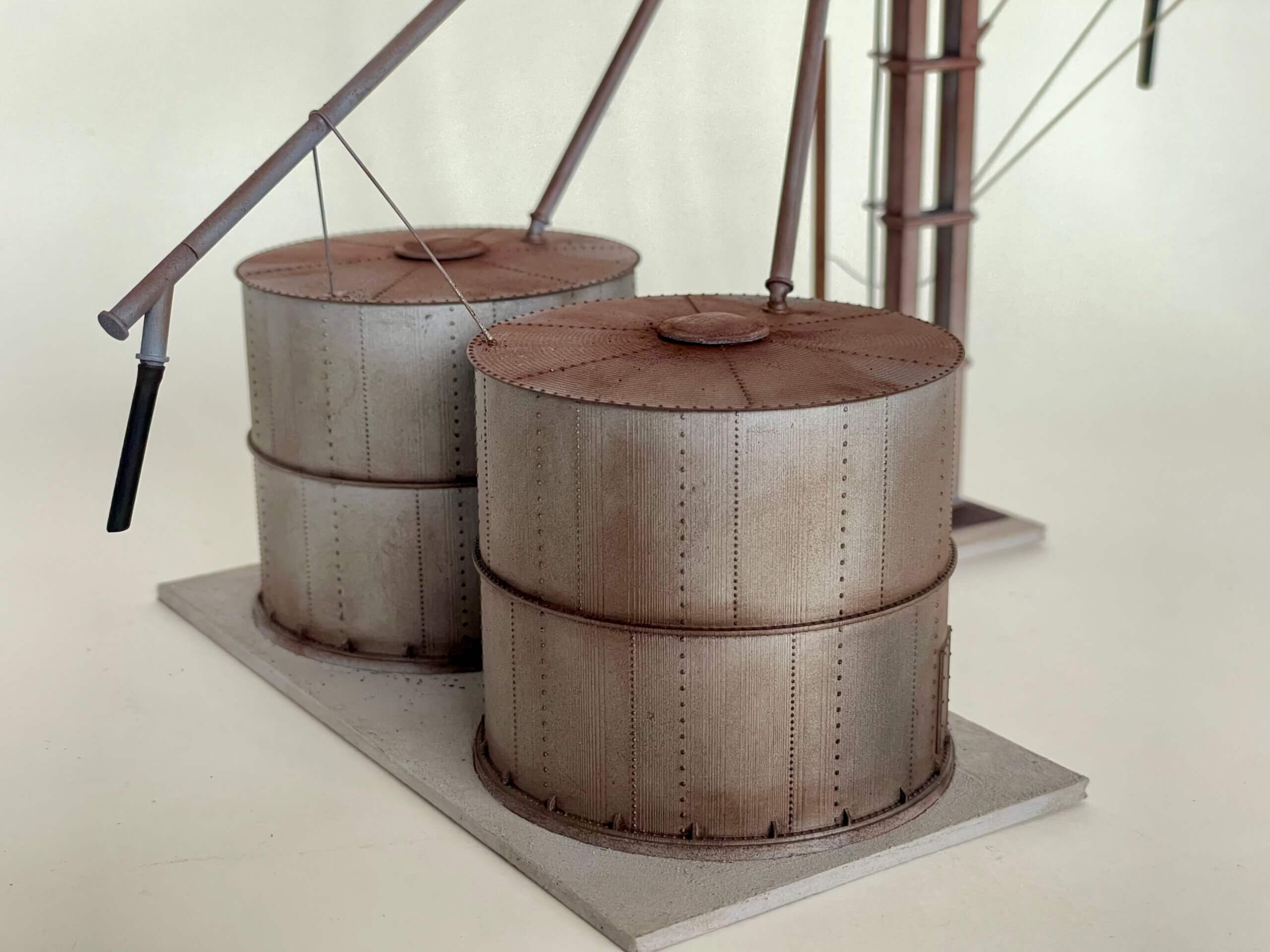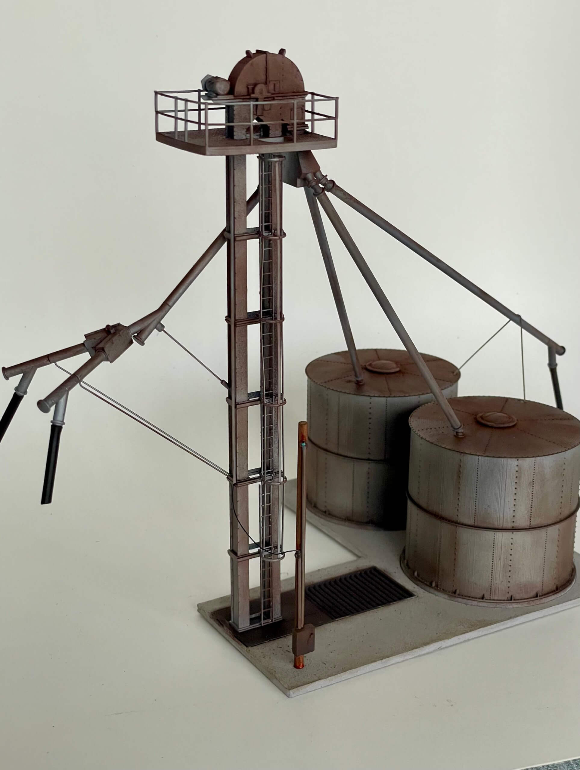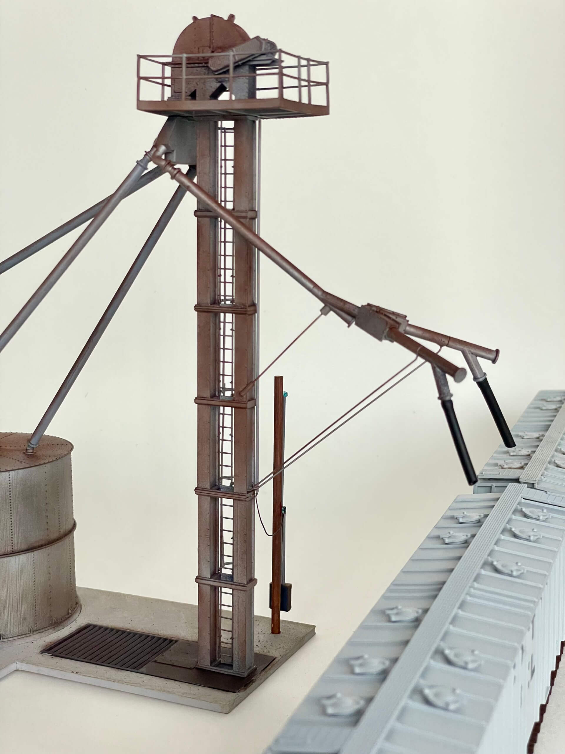 Based on the prototype in Rowena TX on U.S. 67, this transloader has it all. A pit for receiving from trucks, twin spouts for loading hopper cars, and a spout for reloading trucks. A great small scene kit.