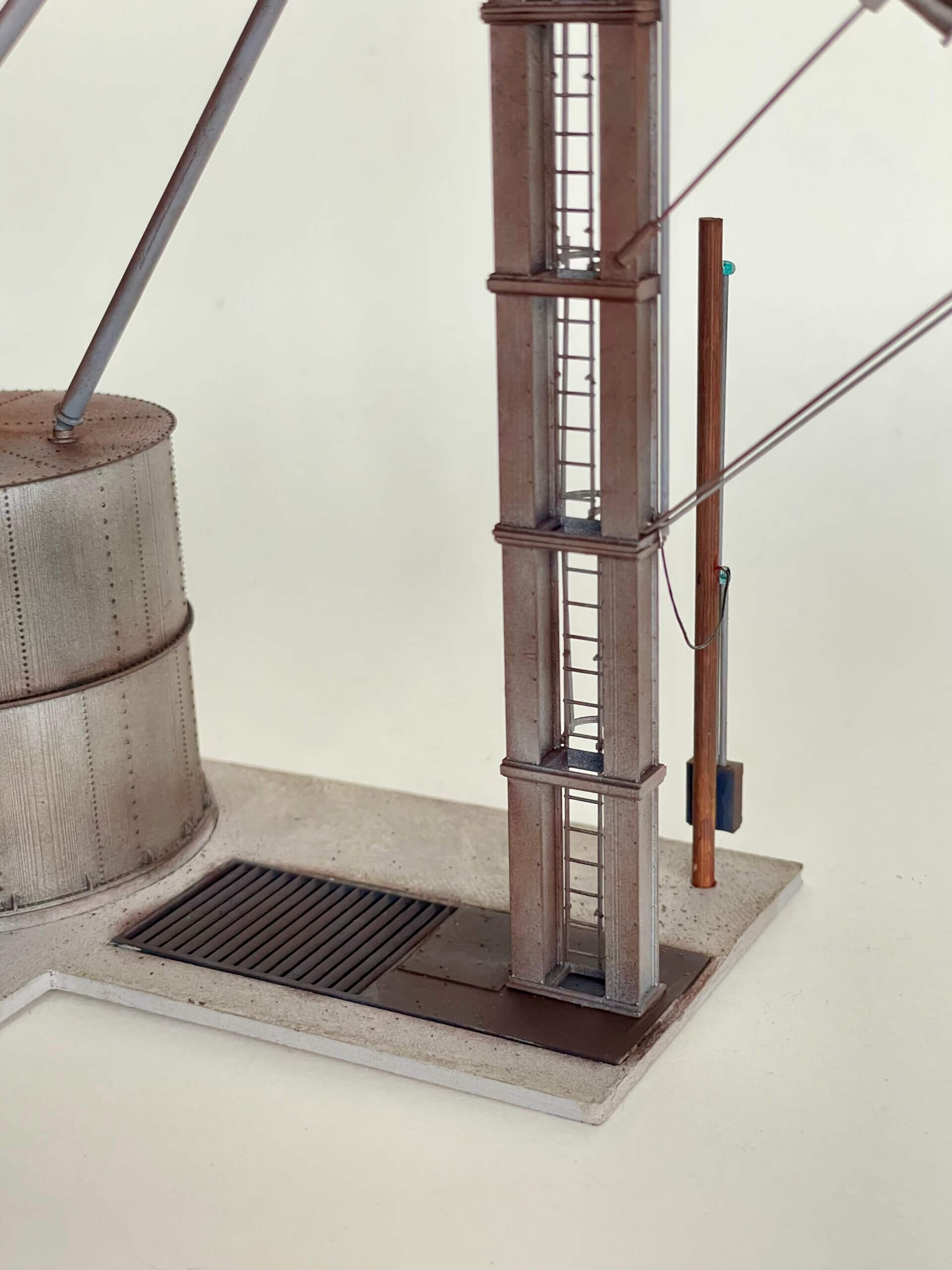 Kit comes complete with instructions, base plate, 2x Columbian Steel Tank bins, Bucket elevator kit, 4 spout distributor, brass rod, wooden power pole, junction box, “seed” beads (to simulate glass insulators), 0.010 solder wire (to simulate the power line connection), 0.035 styrene rod (conduit), 1/16″ heat shrink tubing (to simulate the spout socks), 2x Tichy Caged Ladder Kits, Specialized 1 to 2 spout diverter, bucket elevator base w/ truck dump.